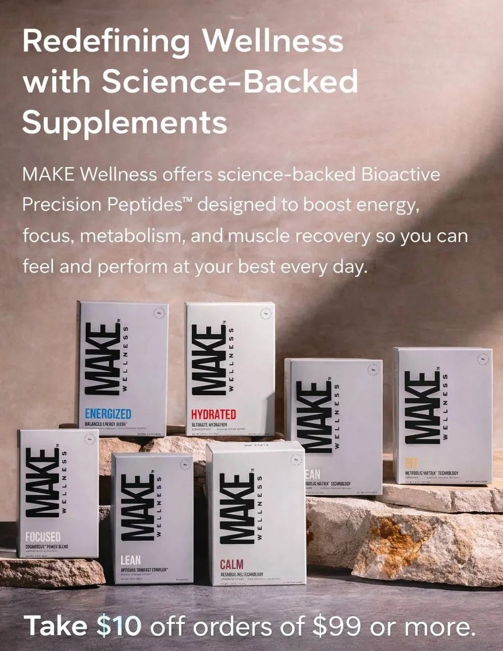 MAKE Wellness uses Bioactive Precision Peptides built on real science, not hype, to support energy, mental clarity, metabolism, and muscle recovery. These are clean, transparent, research driven formulations designed to help your body function the way it was meant to.
